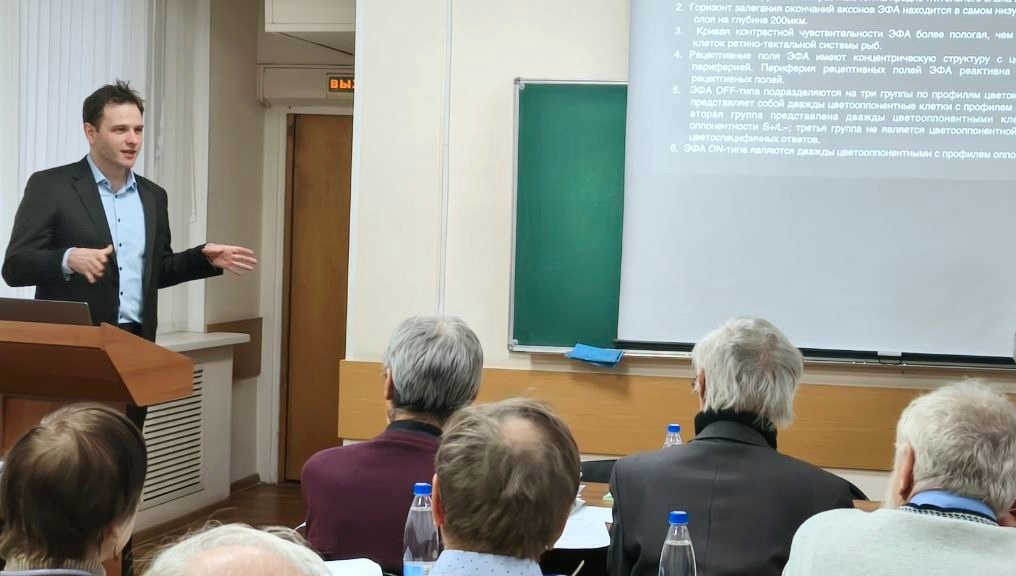 Диссертация Алексея Алипера «Структура рецептивных полей и цветокодирующие свойства элементов с фоновой активностью ретинотектальной системы карпообразных рыб» посвящена изучению элементов с фоновой активностью (ЭФА) — одному из классов ганглиозных клеток сетчатки, проецирующихся в средний мозг рыб. В ходе исследования удалось выявить ряд уникальных свойств ЭФА.